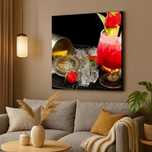„Conjure Flavor“ ist ein dynamischer Leinwanddruck, der einen bunten Cocktail mit Erdbeeren, Ananas und Eiswürfeln zeigt. Diese Szene voller Frische und Energie passt perfekt in moderne Interieurs und zieht mit ihren intensiven Farben und dem Kontrast vor dem schwarzen Hintergrund die Blicke auf sich.