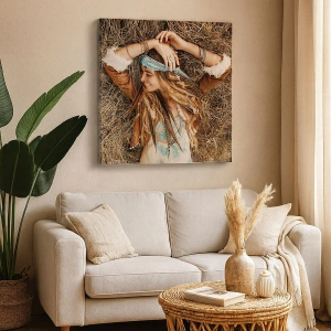 Bild auf Leinwand - Leinwandbild - Frau im Boho-Stil liegt auf Heu - 160x50cm - Auf dem Weg in den Sommer der Liebe - Moderne Wanddekoration für Wohnzimmer und Schlafzimmer ARTTOR