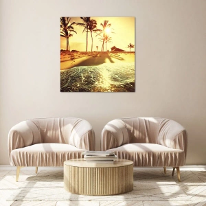 - Ein goldener Strand mit Palmen bei Sonnenuntergang, der eine Atmosphäre der Entspannung und Exotik schafft. Ein perfektes Glasgemälde, das jedes Interieur erhellt.