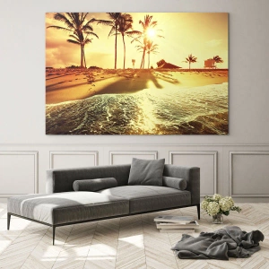 Glasbild - Bild auf glas - Goldener Strand mit Palmen bei Sonnenuntergang und ruhigem Meer - 70x50cm - Kalifornien am Nachmittag - Moderne Wanddekoration für Wohnzimmer und Schlafzimmer ARTTOR