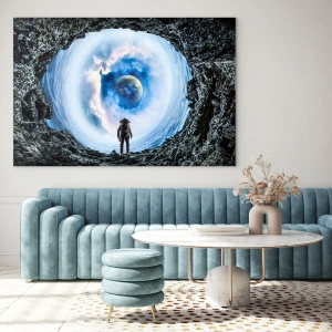 Wandbild – Nicht weit von zu Hause – Astronaut blickt aus einer Felsenhöhle auf die Erde
