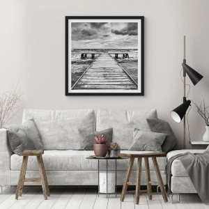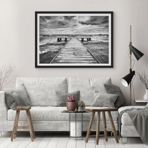 Poster in einem schwarzem Rahmen - Eine Schwarz-Weiß-Ansicht eines Holzstegs über einer stürmischen See. - 70x50cm - Ich warte darauf, dass der Wind wegjagt... - Moderne Wanddekoration für Wohnzimmer und Schlafzimmer ARTTOR