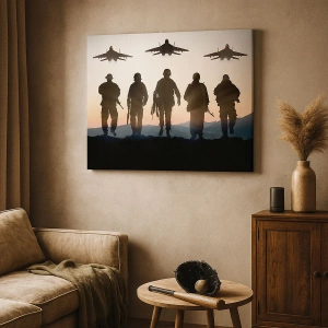 Die Dynamik dieser Komposition fängt den Charakter von Soldaten und ihre Standhaftigkeit angesichts von Herausforderungen perfekt ein. Kampfjets im Flug verleihen dem Bild eine moderne Note und passen perfekt zu militärischen und zeitgenössischen Stilen. Dieses einzigartige Kunstwerk inspiriert und motiviert und ist daher die ideale Wahl für Innenräume, die Stärke und Mut betonen.