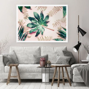 Poster - Tropische Blätter auf hellem Pastellhintergrund - 100x70cm - Eine Studie von Grün auf einem rosa Hintergrund - Moderne Wanddekoration für Wohnzimmer und Schlafzimmer ARTTOR
