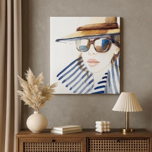 Florida heißt Sie willkommen! ist ein einzigartiges Leinwandgemälde, das durch seinen eleganten Stil und seine Subtilität ins Auge fällt. Die Illustration zeigt eine Frau mit einem breiten Hut und einer großen Sonnenbrille und wurde in Aquarelltechnik erstellt. Die zarten Blau- und Weißtöne verleihen der Komposition Leichtigkeit und betonen gleichzeitig den kultivierten Charakter der Figur. Das Gesicht der Frau bleibt minimalistisch, was dem Werk einen modernen Charme verleiht.