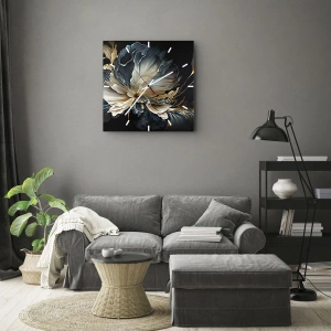 Wanduhr - Glasuhr - Eine ausgefallene Blume mit fließenden Formen in Gold und Marineblau. - 30x30cm - Märchenhafte Farnblume - Moderne Wanddekoration für Wohnzimmer, Küche und Schlafzimmer ARTTOR