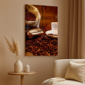 Wandbild – Riechen Sie es? – Eine Tasse Kaffee vor einem Hintergrund aus Kaffeebohnen und einem Getreidesack