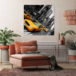 • Ein dynamisches Foto von gelben Taxis an einer städtischen Kreuzung mit einem auffälligen Kontrast zwischen dem schwarz-weißen Hintergrund und dem leuchtenden Gelb der Fahrzeuge. Eine perfekte Dekoration im urbanen Stil.
