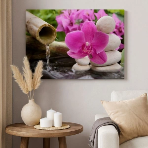 Mit einem ARTTOR-Leinwanddruck entscheiden Sie sich für eine Dekoration, die Ästhetik und Langlebigkeit vereint. Die Komposition mit lila Orchidee und Bambus ist ein inspirierender Akzent, der Ruhe und Harmonie in Ihr Interieur bringt.
