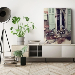 - Das Gemälde zeigt zwei Vintage-Fahrräder vor einer Holztür mit pastellfarbenen Fensterläden. Rustikale Details wie Blumen und sorgfältig ausgewählte Dekorationen runden das Bild ab und verleihen ihm eine warme, provenzalische Atmosphäre.