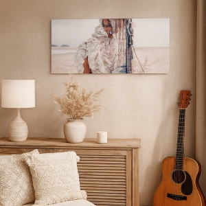 • Frau, Boho, Gitarre, Menschen, Musik, Für das Esszimmer, für den Flur, für das Wohnzimmer, für das Schlafzimmer, Weiss-braun, Quadrat