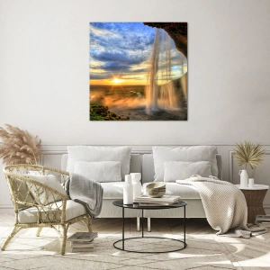 Glasbild - Bild auf glas - Wasserfall mit Blick auf den Sonnenuntergang und das Tal - 70x50cm - Die Welt hinter einem Schleier aus Tropfen - Moderne Wanddekoration für Wohnzimmer und Schlafzimmer ARTTOR
