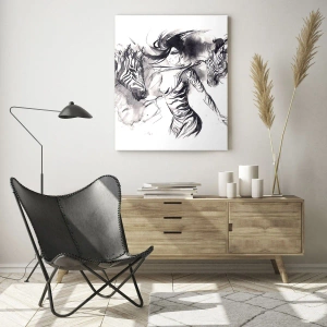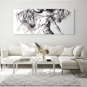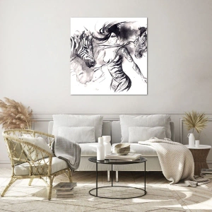 Glasbild - Bild auf glas - Schwarz-Weiß-Komposition mit einer Frau und einem Zebra im künstlerischen Stil - 50x70cm - Tanzen mit den Zebras - Moderne Wanddekoration für Wohnzimmer und Schlafzimmer ARTTOR