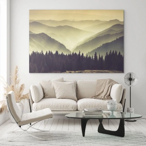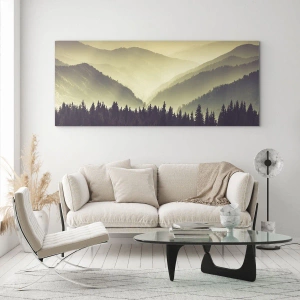Glasbild - Bild auf glas - Ein nebliger Blick auf eine Bergkette mit einem dunklen Wald im Vordergrund - 50x70cm - Hinter den sieben Bergen ... - Moderne Wanddekoration für Wohnzimmer und Schlafzimmer ARTTOR