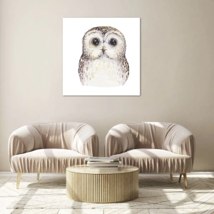Wandbild – Schau mir in die Augen – Eine bezaubernde Eule auf weißem Hintergrund im Aquarellstil