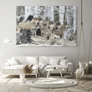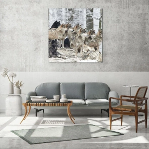 Glasbild - Bild auf glas - Ein Wolfsrudel im Winterwald - 70x50cm - Familie und Freunde - Moderne Wanddekoration für Wohnzimmer und Schlafzimmer ARTTOR