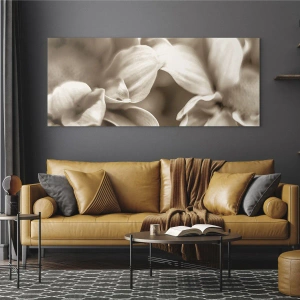 Glasbild - Bild auf glas - Makrofotografie von hellen Blütenblättern in Sepia - 70x50cm - So sanft wie ein Lächeln - Moderne Wanddekoration für Wohnzimmer und Schlafzimmer ARTTOR