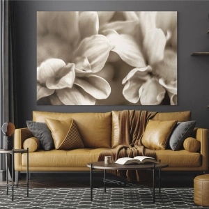 - Das Gemälde zeigt zarte Blütenblätter in einer Makroaufnahme in Sepia-Ton. Weiche Linien, dezente Beleuchtung und ruhige Farben verleihen der Komposition eine romantische, beruhigende Atmosphäre.