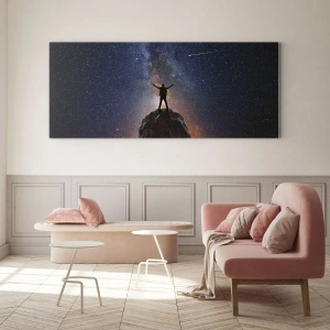 Die Figur vor dem Nachthimmel symbolisiert Mut, Freiheit und den Wunsch, das Unbekannte zu entdecken. Die Komposition ist perfekt ausbalanciert – die dunklen Töne des Himmels stehen im Kontrast zum subtilen Licht, das von den Sternen gestreut wird. Im Hintergrund ist außerdem die helle Spur eines vorbeiziehenden Sterns sichtbar, die für Dynamik sorgt und die emotionale Wirkung des Bildes noch verstärkt.