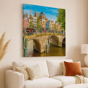 Bild auf Leinwand - Leinwandbild - Ein malerischer Kanal mit einer Brücke in Amsterdam - 140x50cm - Frühling am Kanal - Moderne Wanddekoration für Wohnzimmer und Schlafzimmer ARTTOR