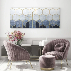 Glasbild - Bild auf glas - Geometrisches Muster in Gold- und Marineblautönen - 120x50cm - Komposition im synkopischen Rhythmus - Moderne Wanddekoration für Wohnzimmer und Schlafzimmer ARTTOR