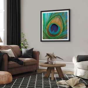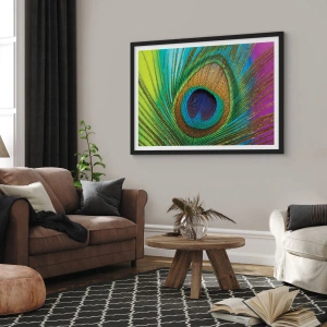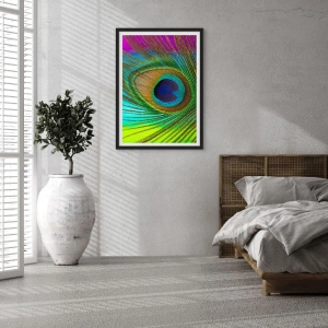 Poster in einem schwarzem Rahmen - Nahaufnahme einer Pfauenfeder mit lebendigen Farben - 70x50cm - Auge in Auge - Moderne Wanddekoration für Wohnzimmer und Schlafzimmer ARTTOR