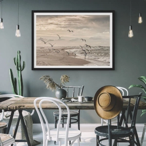 - Dieses Poster zeigt Möwen am Meeresufer unter bewölktem Himmel. Die dezenten Farben und die natürliche Landschaft vermitteln Harmonie und Ruhe. Es ist die perfekte Dekoration für von Natur und Minimalismus inspirierte Innenräume.