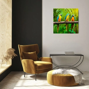 Wanduhr - Glasuhr - Drei bunte Papageien vor einem Hintergrund aus tropischem Grün - 30x30cm - Und hast du gehört, dass sie ...? - Moderne Wanddekoration für Wohnzimmer und Schlafzimmer ARTTOR