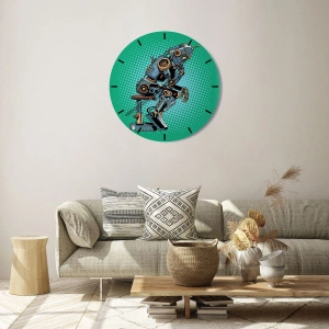 - Eine Wanduhr mit einem philosophischen Robotermotiv im retro-futuristischen Stil, perfekt für Kunst- und Technikliebhaber.