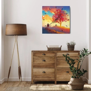 Wanduhr - Glasuhr - Eine Figur auf einem Hügel neben einem bunten Baum im Licht der untergehenden Sonne - 30x30cm - Pilger am Ziel - Moderne Wanddekoration für Wohnzimmer und Schlafzimmer ARTTOR