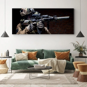 Bild auf Leinwand - Leinwandbild - Ein Soldat in voller Montur mit einem Gewehr - 50x70cm - Tödlich wirksam - Moderne Wanddekoration für Wohnzimmer und Schlafzimmer ARTTOR