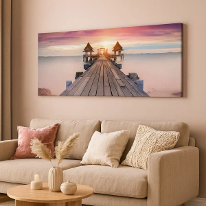 Bild auf Leinwand - Leinwandbild - Holzsteg führt zu Pavillons bei Sonnenuntergang - 70x100cm - Westen im Osten - Moderne Wanddekoration für Wohnzimmer und Schlafzimmer ARTTOR