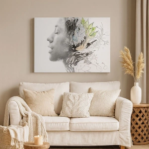 - Das Profil einer Frau in einer künstlerischen Collage, die Natur, Blätter und subtile schwarze Details kombiniert. Ein elegantes und zartes Bild, perfekt für die Dekoration eines modernen Interieurs.