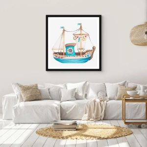 Poster in einem schwarzem Rahmen - Aquarellschiff in Pastelltönen von Blau und Beige - 50x70cm - Ahoi, Abenteuer! - Moderne Wanddekoration für Wohnzimmer und Schlafzimmer ARTTOR
