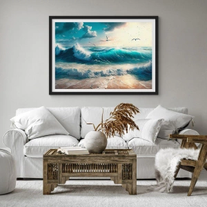 - Das Poster zeigt türkisfarbene Wellen, die an eine goldene Küste brechen. Die dynamische Komposition in Kombination mit sanfter Beleuchtung verleiht dem Bild eine harmonische, sommerliche Atmosphäre, die perfekt in ruhige Innenräume passt.