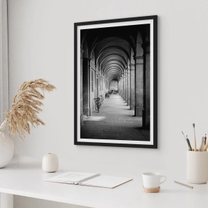 - Das Poster zeigt eine beeindruckende Schwarz-Weiß-Fotografie der Arkaden, die durch perfekte Symmetrie und perspektivische Tiefe besticht. Der Kontrast von Licht und Schatten unterstreicht die Eleganz der Architektur.