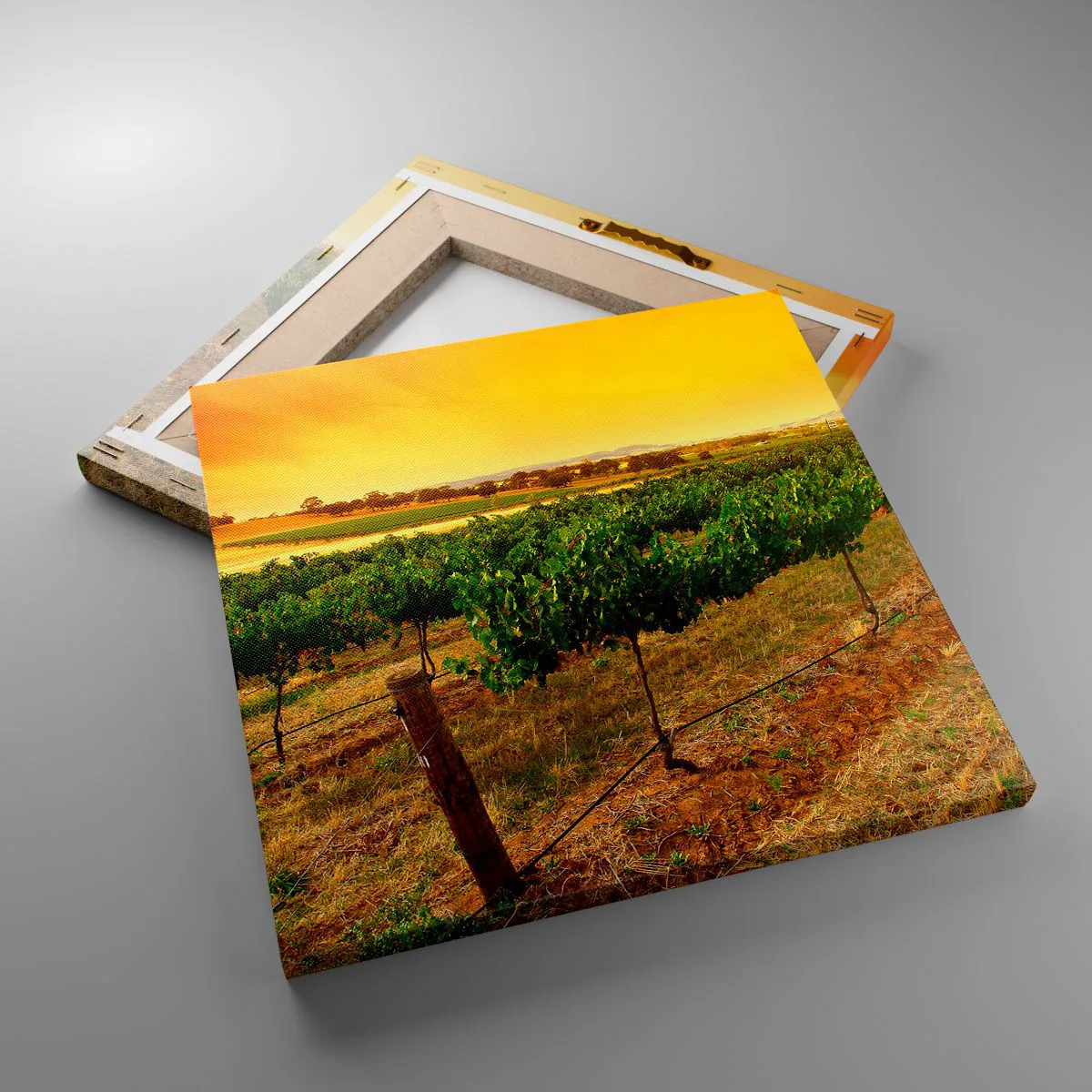 Die Leinwand wird über den Rahmen gespannt. Die Seiten und Kanten werden gedruckt, um das Bild fortzusetzen. Das Bild ist fertig zum Aufhängen an der Wand. Jedes Produkt hat einen am Rahmen befestigten Anhänger und ein Montageset (Schraube + Stift).