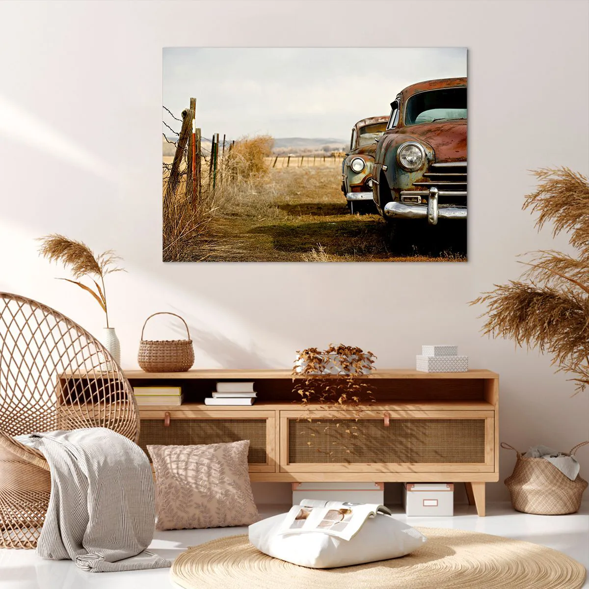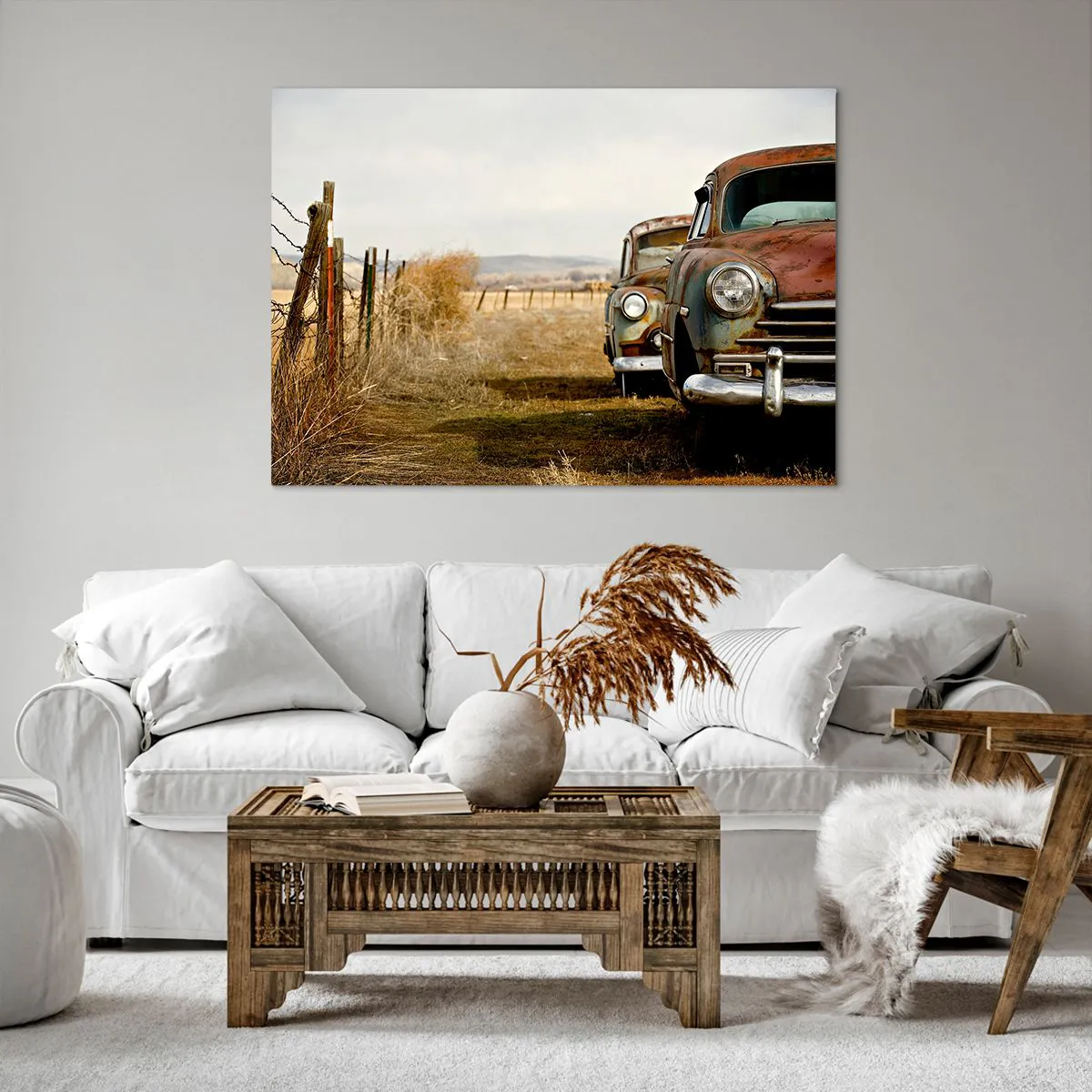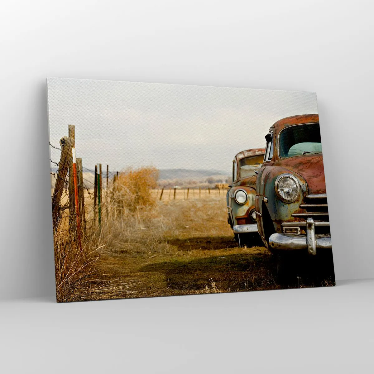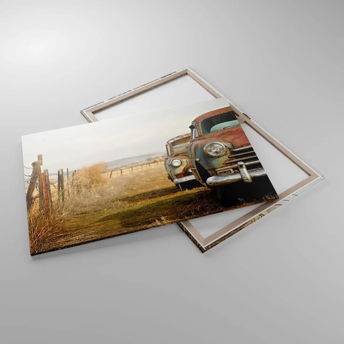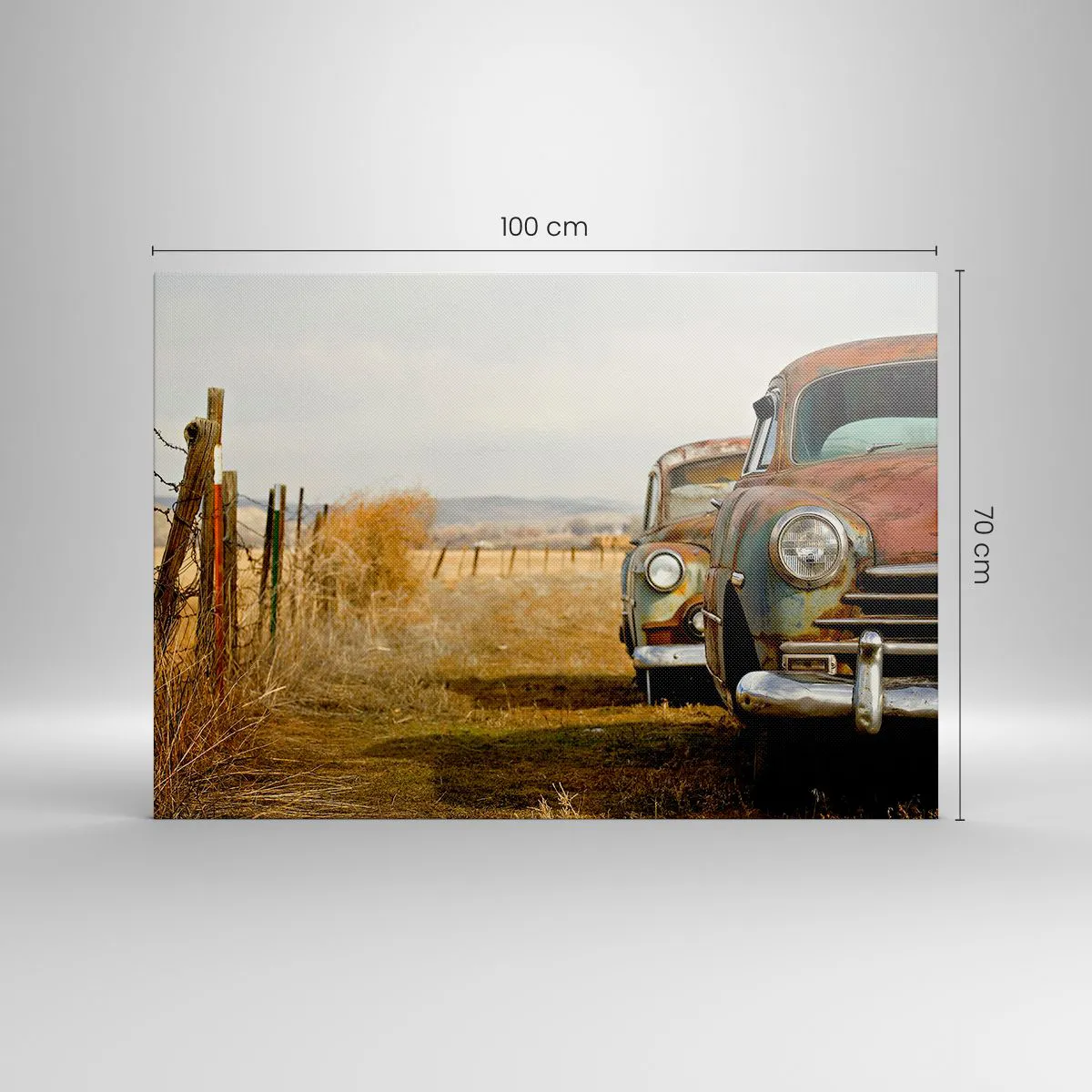 Bild auf Leinwand - Leinwandbild - Zwei alte Autos auf einem Feldweg neben einem Holzzaun - 100x70cm - Eine wohlverdiente Ruhe - Moderne Wanddekoration für Wohnzimmer und Schlafzimmer ARTTOR