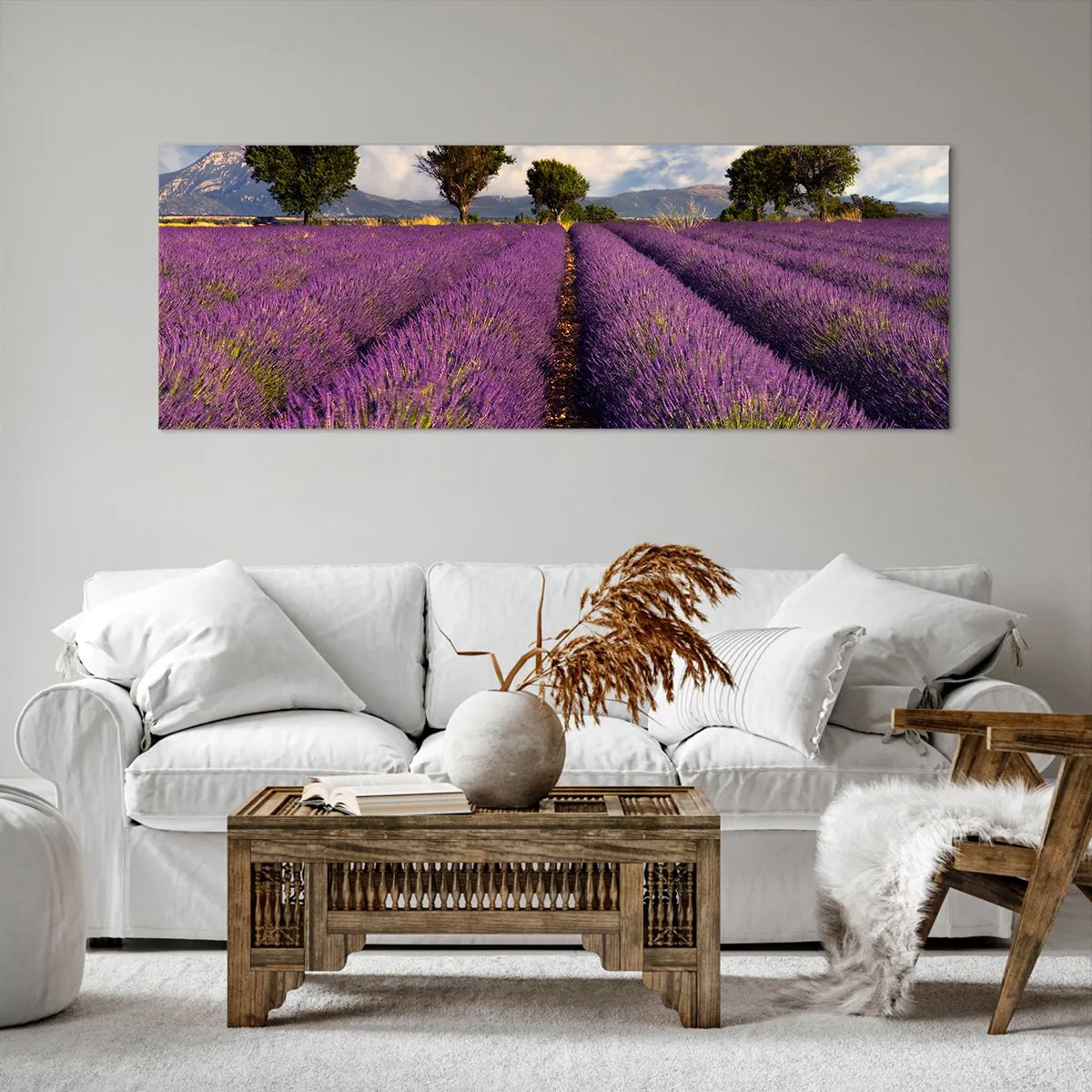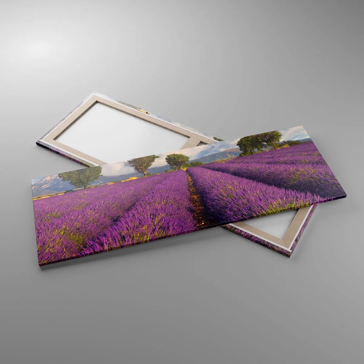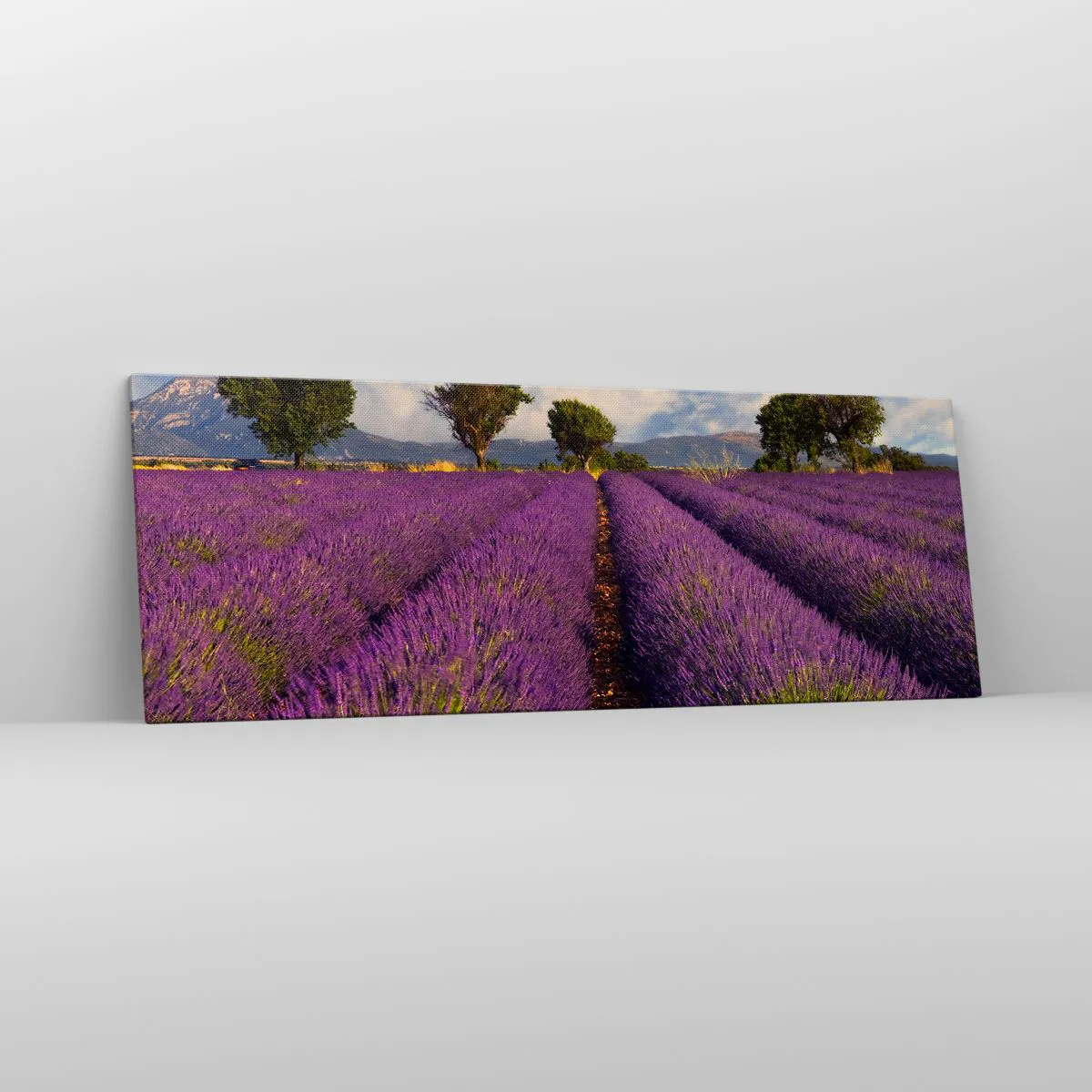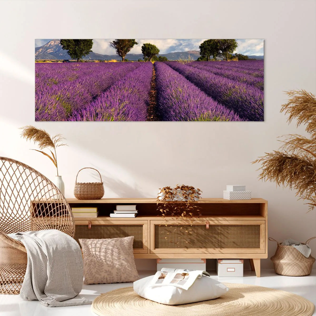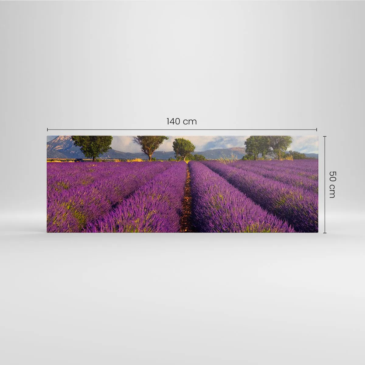 Bild auf Leinwand - Leinwandbild - Ein Lavendelfeld mit Bäumen vor der Kulisse von Bergen und Himmel - 140x50cm - Lavendelfelder - Moderne Wanddekoration für Wohnzimmer und Schlafzimmer ARTTOR