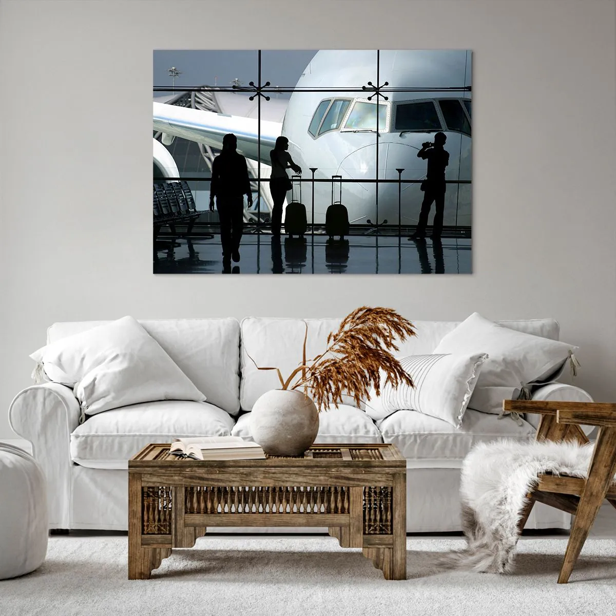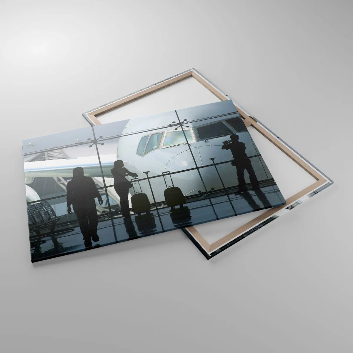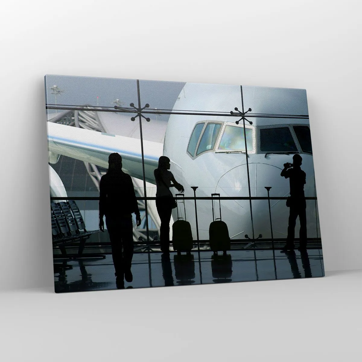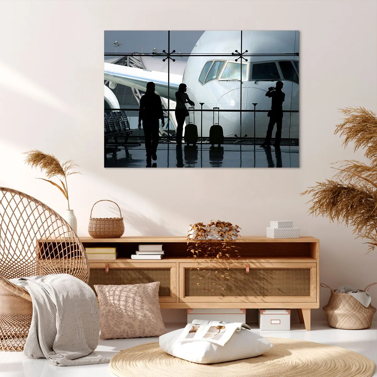 Bild auf Leinwand - Leinwandbild - Flughafen mit Silhouetten von Menschen und Blick auf das Flugzeug - 100x70cm - Vis a vis am Flughafen - Moderne Wanddekoration für Wohnzimmer und Schlafzimmer ARTTOR