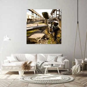 Bild auf Leinwand - Leinwandbild - Ein Paintball-Spieler in Tarnkleidung zielt mit einem Markierer - 140x50cm - Auch du kannst ein Held werden - Moderne Wanddekoration für Wohnzimmer und Schlafzimmer ARTTOR