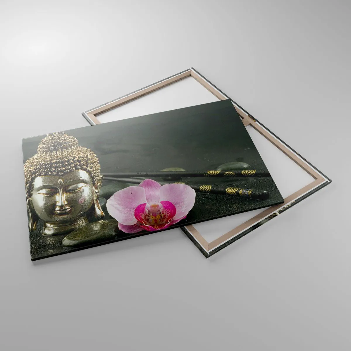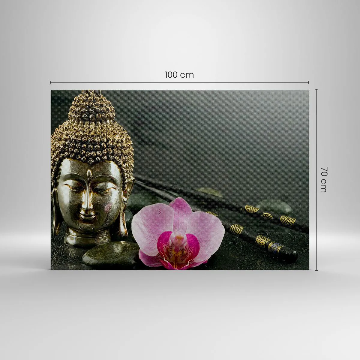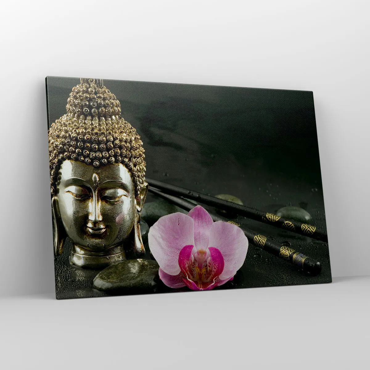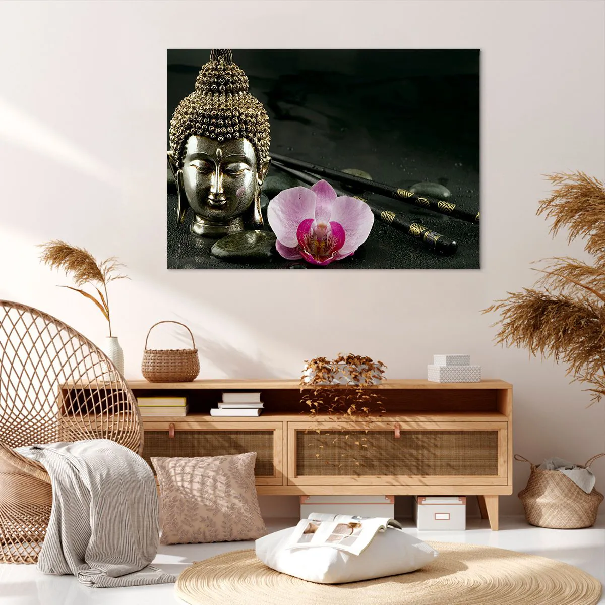 Bild auf Leinwand - Leinwandbild - Eine Buddha-Statuette mit Orchidee und Essstäbchen vor einem Hintergrund aus Steinen - 100x70cm - Harmonie von Weisheit und Schönheit - Moderne Wanddekoration für Wohnzimmer und Schlafzimmer ARTTOR