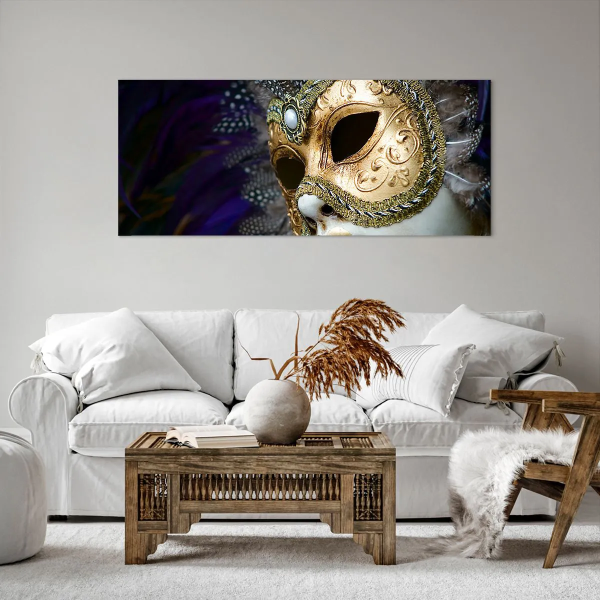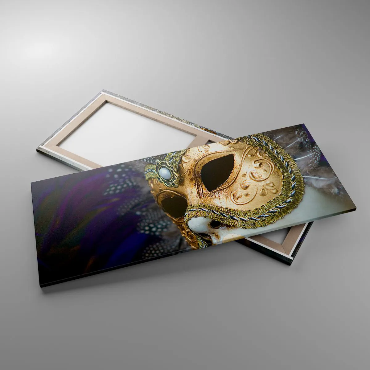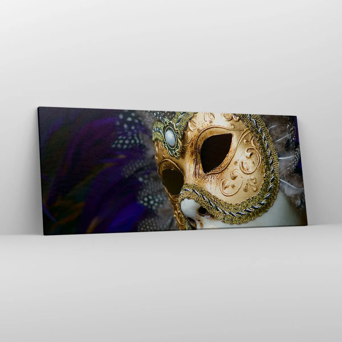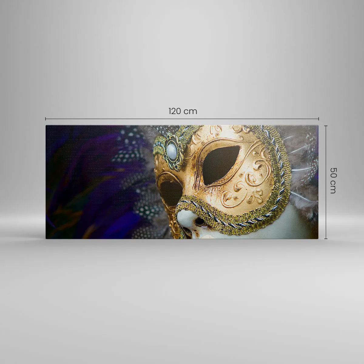 Bild auf Leinwand - Leinwandbild - Goldene venezianische Maske mit dekorativen Federn und Ornamenten - 120x50cm - Venezianisches Porträt in Gold - Moderne Wanddekoration für Wohnzimmer und Schlafzimmer ARTTOR