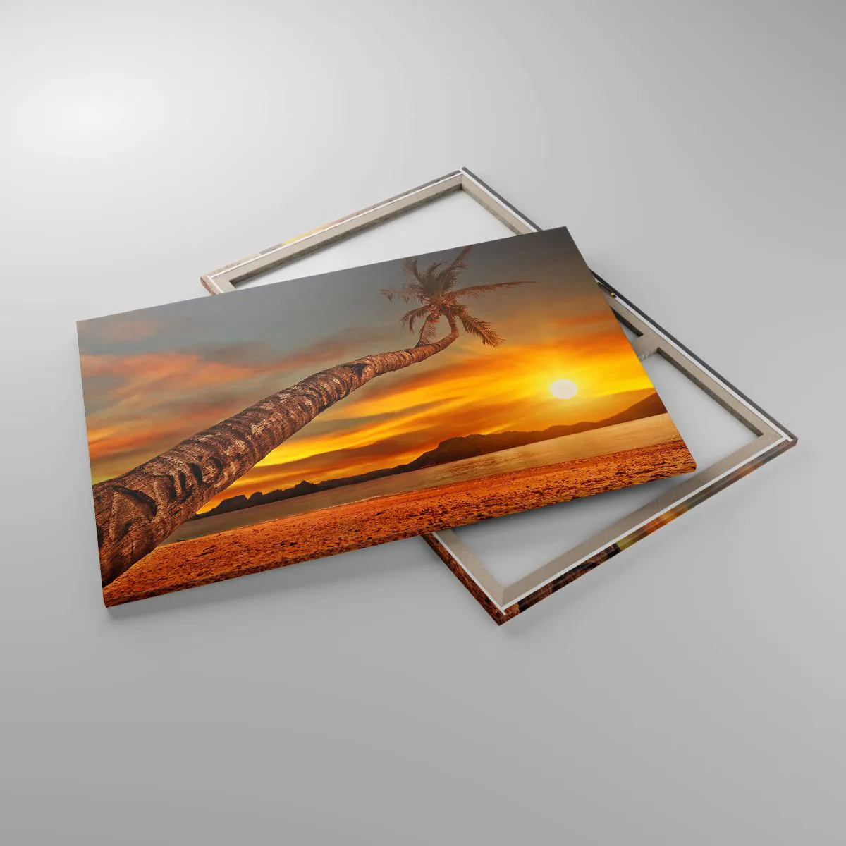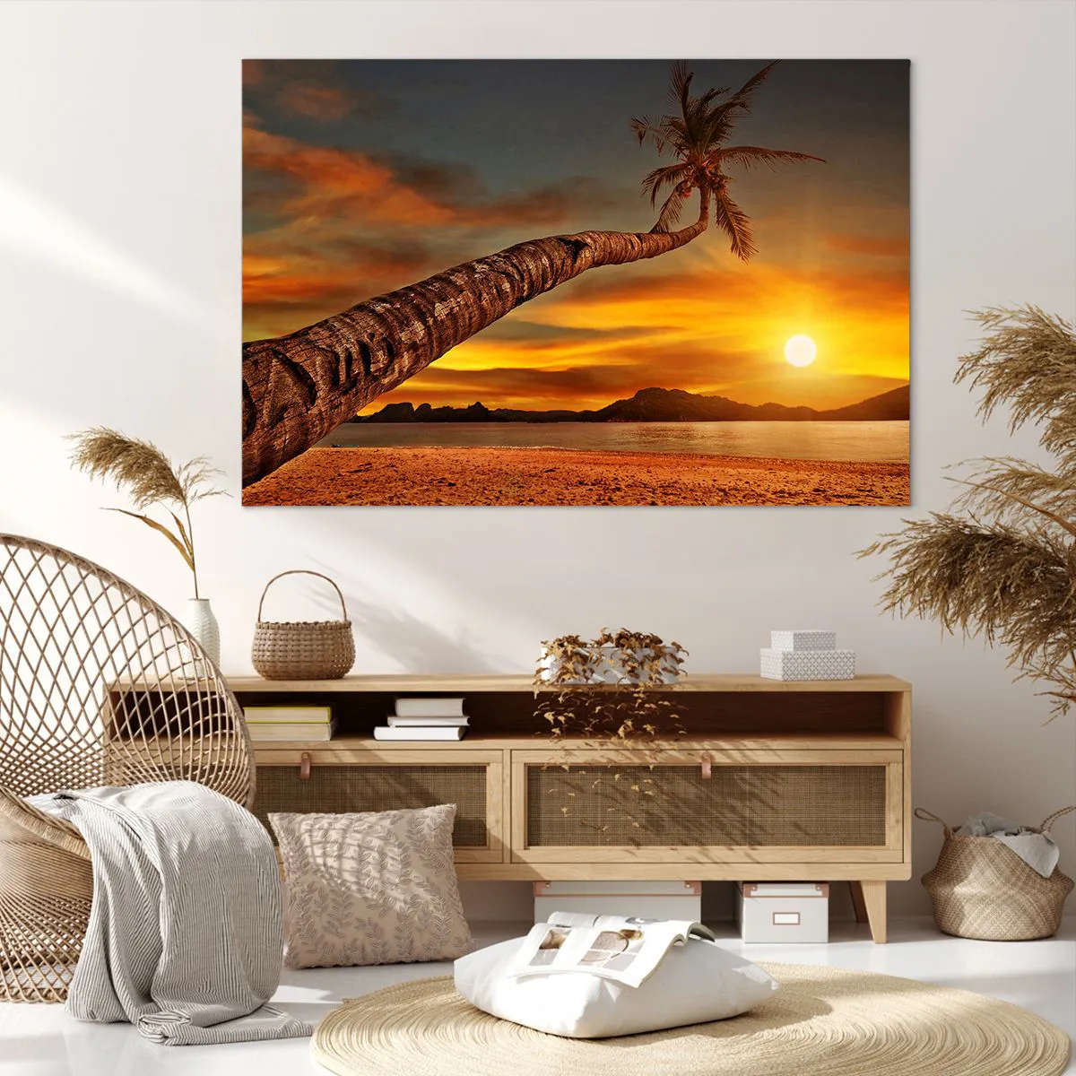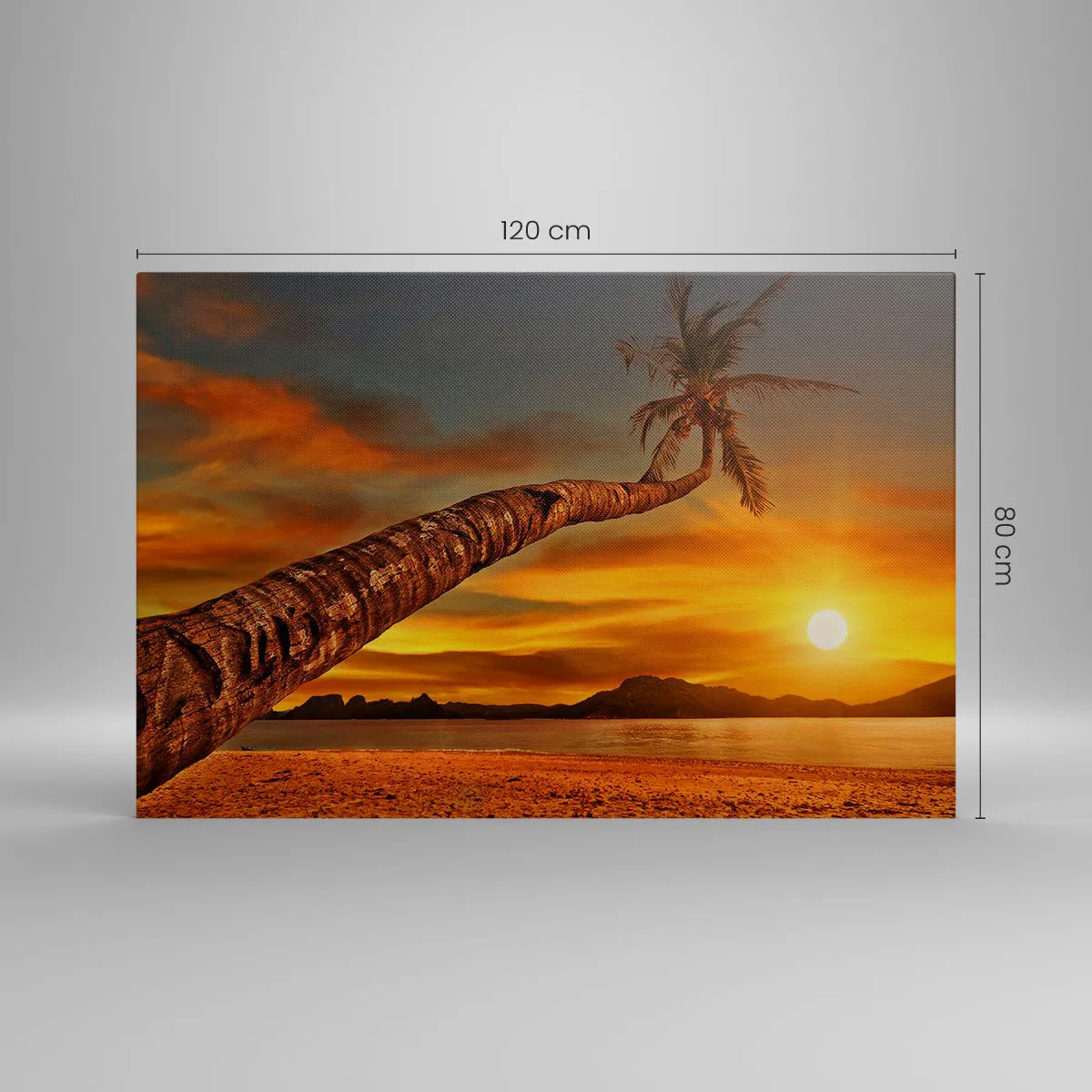 Bild auf Leinwand - Leinwandbild - Palme am Strand bei Sonnenuntergang mit Blick auf das Meer - 120x80cm - Exotischer Urlaub, karibisches Abenteuer - Moderne Wanddekoration für Wohnzimmer und Schlafzimmer ARTTOR