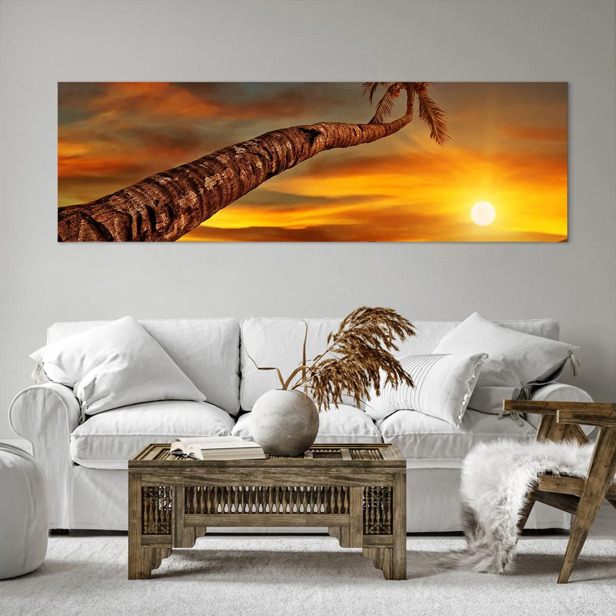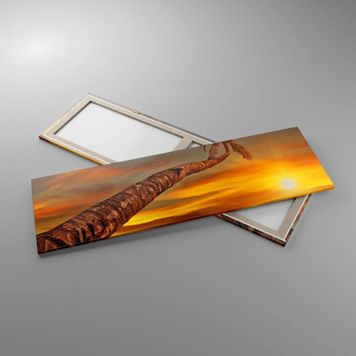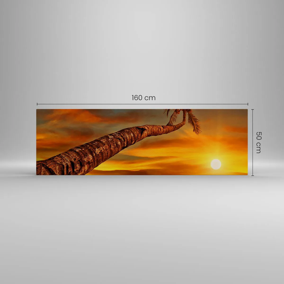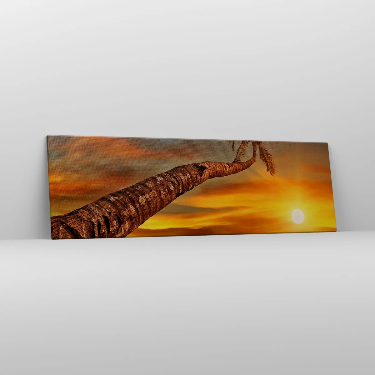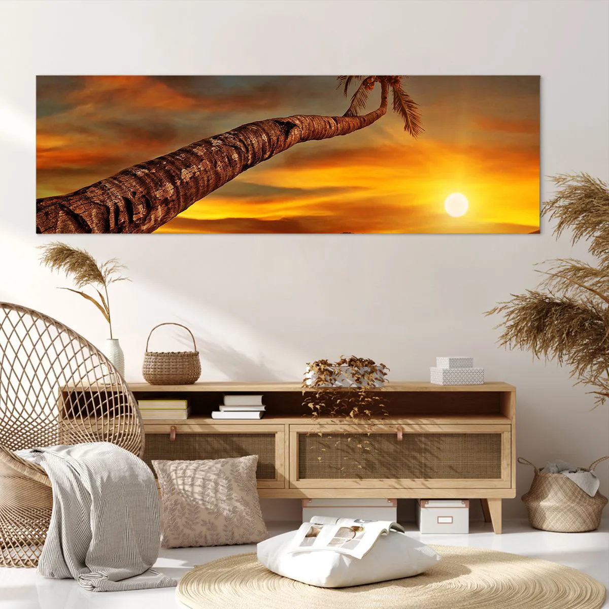 Bild auf Leinwand - Leinwandbild - Palme am Strand bei Sonnenuntergang mit Blick auf das Meer - 160x50cm - Exotischer Urlaub, karibisches Abenteuer - Moderne Wanddekoration für Wohnzimmer und Schlafzimmer ARTTOR