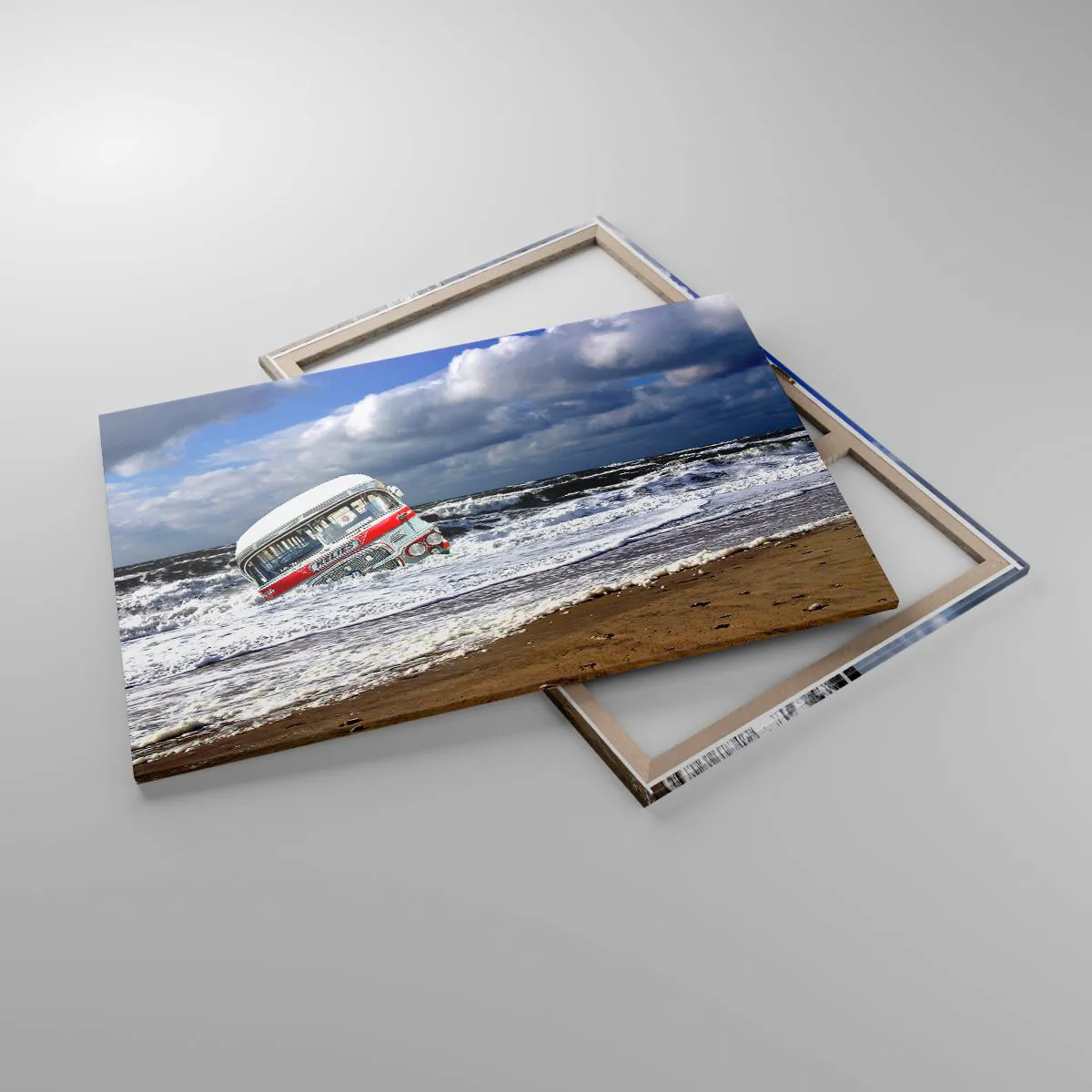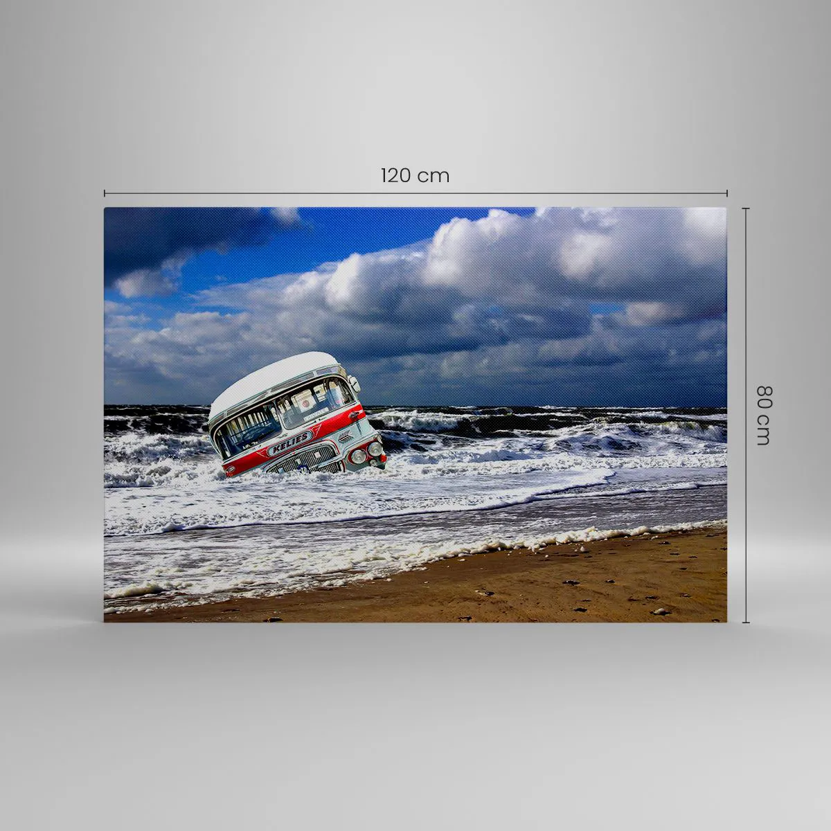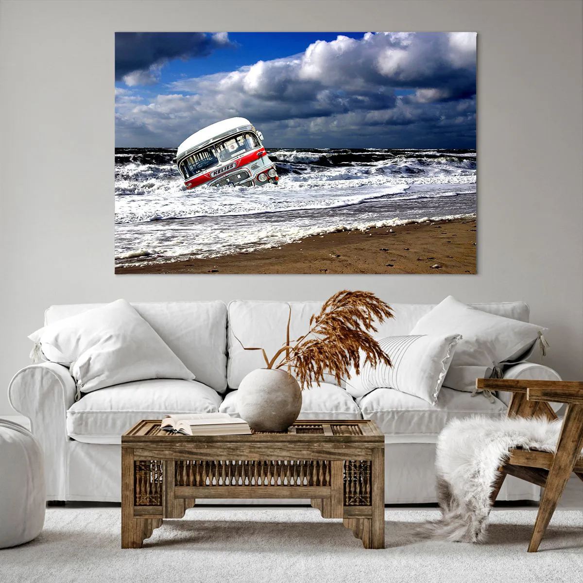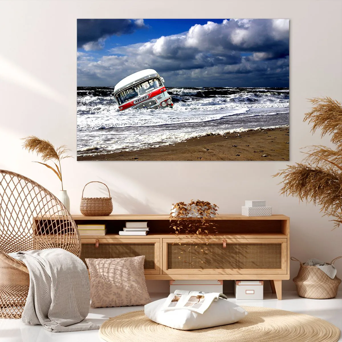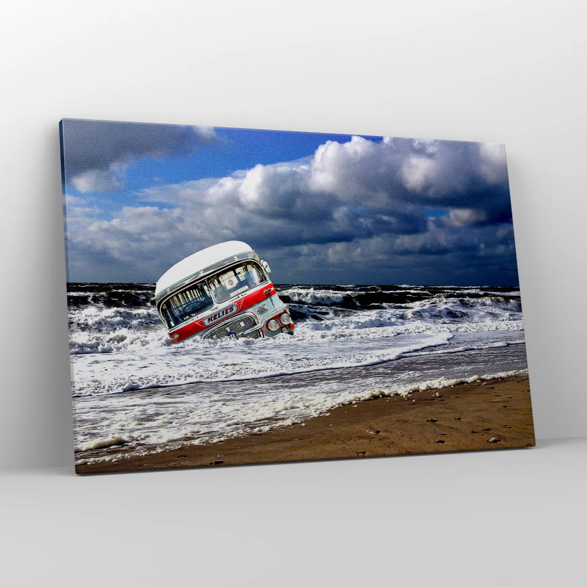 Bild auf Leinwand - Leinwandbild - Ein versunkener Bus am Strand inmitten von Wellen und rauer See - 120x80cm - Und was stehst du so erstaunt? - Moderne Wanddekoration für Wohnzimmer und Schlafzimmer ARTTOR