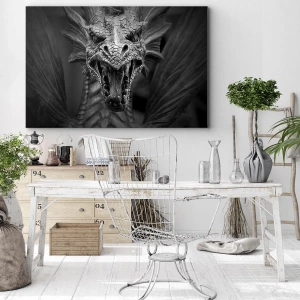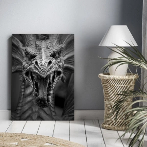 - Ein beeindruckender Drachenkopf in Schwarzweiß mit auffälligen Details. Das Bild strahlt ein Gefühl von Bedrohung, Macht und Geheimnis aus und passt perfekt in moderne Innenräume.