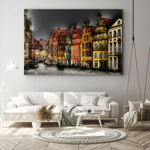 Die Leinwand wird über den Rahmen gespannt. Die Seiten und Kanten werden gedruckt, um das Bild fortzusetzen. Das Bild ist fertig zum Aufhängen an der Wand. Jedes Produkt hat einen am Rahmen befestigten Anhänger und ein Montageset (Schraube + Stift).