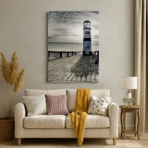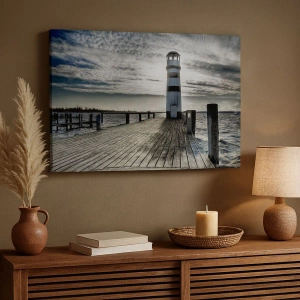 Bild auf Leinwand - Leinwandbild - Leuchtturm auf einem Holzsteg mit Blick auf das Meer. - 70x50cm - Matrosen, ich warte auf euch - Moderne Wanddekoration für Wohnzimmer und Schlafzimmer ARTTOR