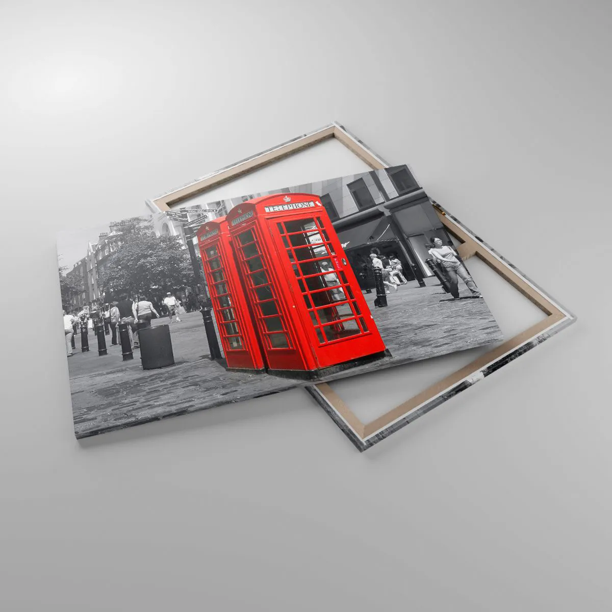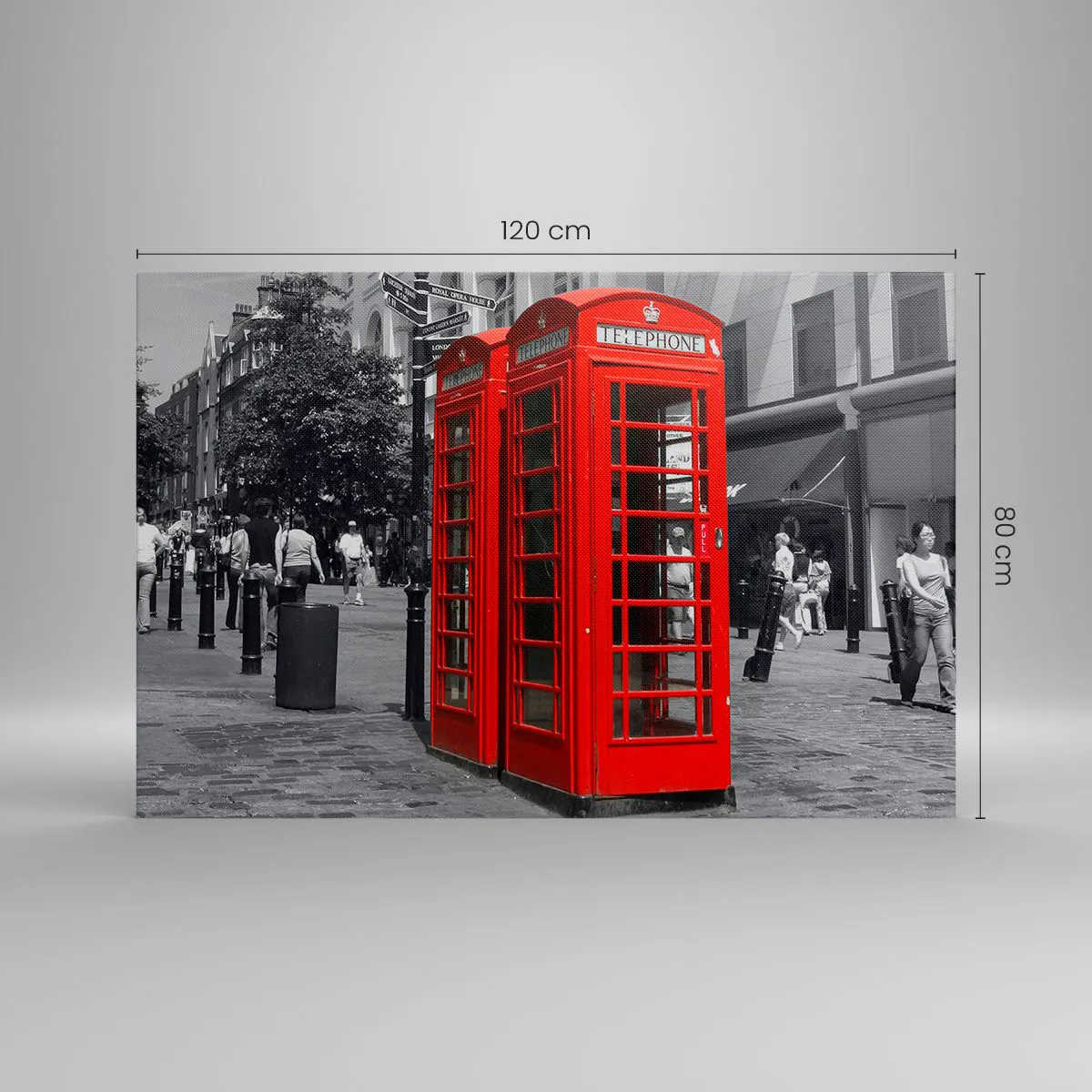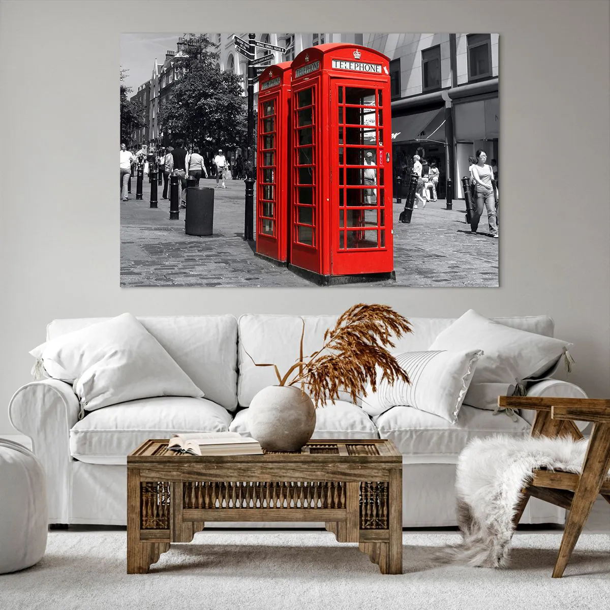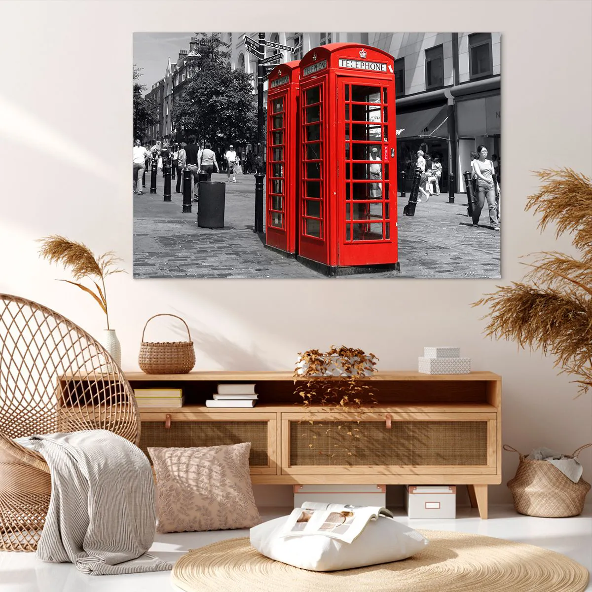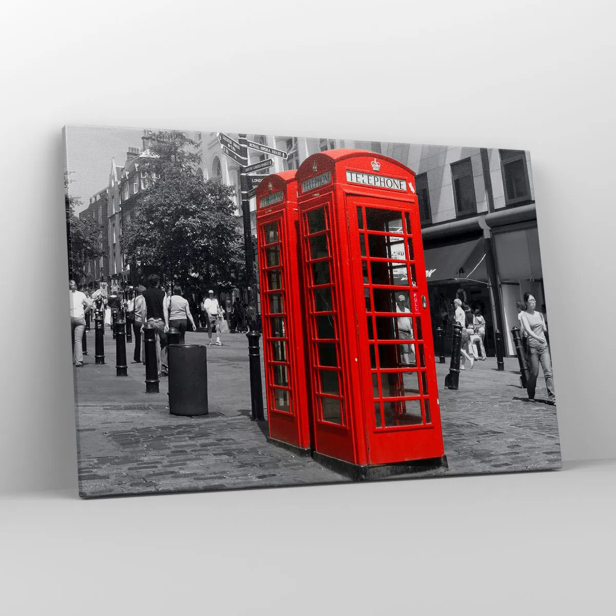 Bild auf Leinwand - Leinwandbild - Rote Telefonzellen vor einer schwarz-weißen Stadtkulisse. - 120x80cm - Rote Telefonzellen - Moderne Wanddekoration für Wohnzimmer und Schlafzimmer ARTTOR
